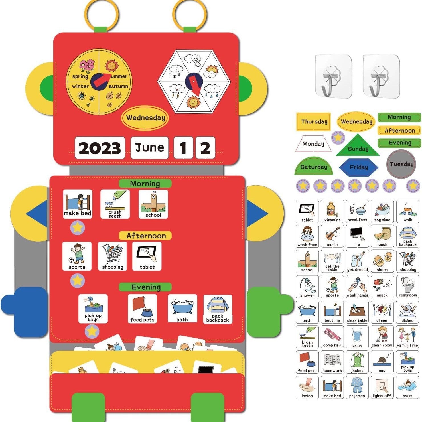 A durable visual routine and daily planning tool designed for young children, featuring: